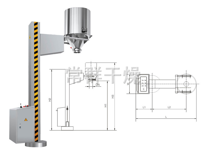 ??TJG 系列固定提升加料機(jī)由兩部分組成,即提升機(jī)及底座。提升機(jī)由機(jī)架、液壓提升系統(tǒng)及料門翻轉(zhuǎn)機(jī)構(gòu)組成。工作時(shí),先將提升機(jī)的料門與料桶扣合,啟動(dòng)提升操作桿,料門與料桶一起上升,啟動(dòng)翻轉(zhuǎn)操作桿,料桶即可番轉(zhuǎn)180度,呈底桶向上姿態(tài)并移動(dòng)到所需位置,利用料門上出料蝶閥,可很容易將物料加入所需的工藝設(shè)備中。
